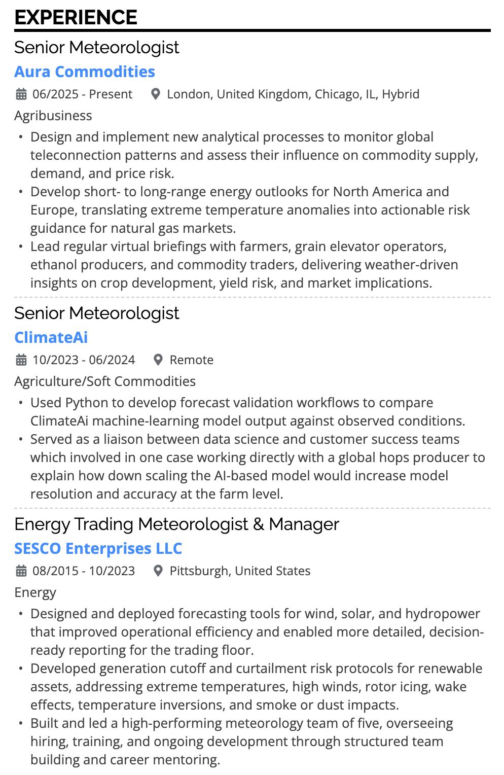 If you are a little more interested in climate, especially climate resiliency, or you can't find any jobs, then I would consider going this route. The job description is pretty much written where you could answer every requirement with something you do as a meteorologist.