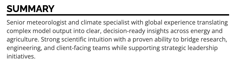 I like to add a summary at the top that wraps up my experience into a short paragraph. I don't use the same summary for every job; instead, I change it up depending on the type of job. Whatever job opening I used this resume for, it was likely something very specific, as the content of the summary is climate and engineering-focused. This was probably a stretch job where I wasn't completely qualified, so I used big words to make it sound like maybe I knew more than I do.