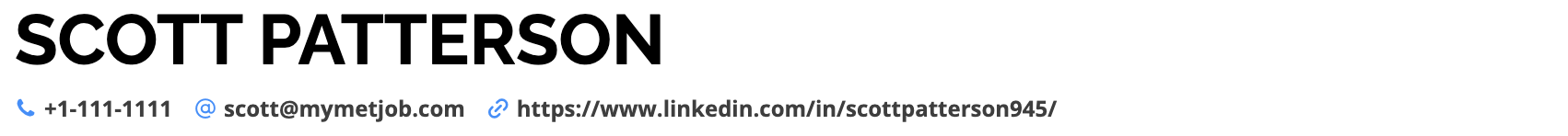 This should clearly state your name in the largest font you use on the resume, at least twice as large as any other section titles. This is the top of my resume. I use sans-serif font. Then, contact information below. You don't have to link to your LinkedIn; you could use your own website or anything else that would cast you in a good light.